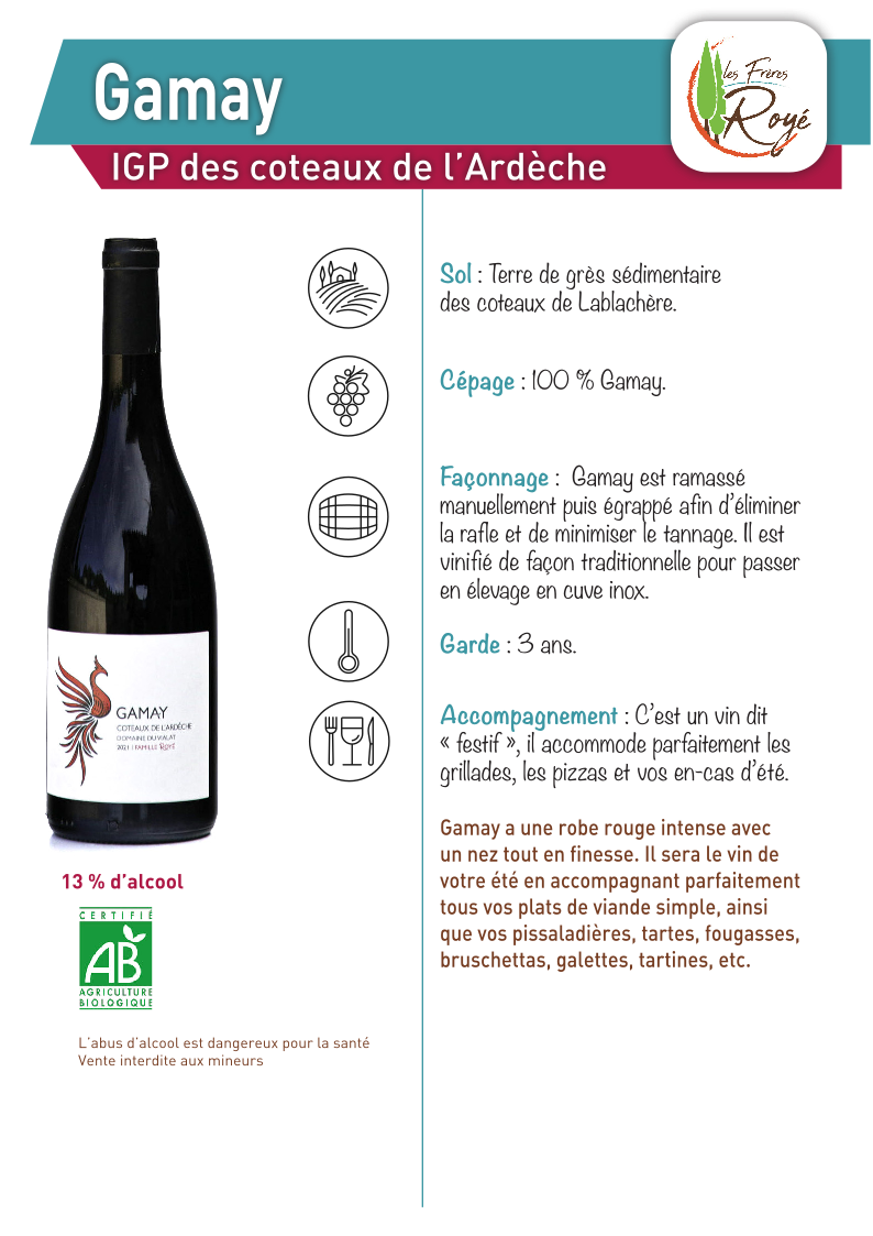 Rouge fruité et gourmand, peut être dégusté frais pour accompagner entrée, pizza ou grillade.